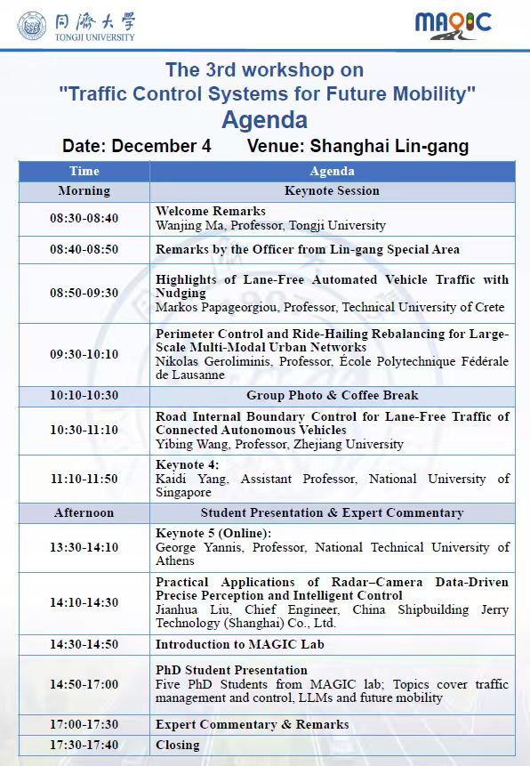 Prof. Markos Papageorgiou was invited to deliver a keynote presentation entitled "Highlights of lane-free automated vehicle traffic with nudging" at the 3rd Workshop on Traffic Control Systems for Future Mobility that was held at Tongji University, Shanghai, China on December 4, 2025.